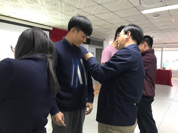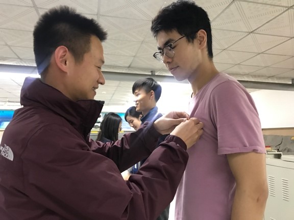 随后三位出席老师为学员代表佩戴团徽,学员代表进行了发言。2019级本科生王述冰同学讲述了自开学军训以来自身思想意识的转变发展过程,他希望可以在北大这个红色种子发芽的地方积极向党组织靠拢,也希望珍惜团校的学习机会,不断提升自己。在发言的最后,王述冰庄严承诺将一丝不苟、脚踏实地参加团校学习,做一个有担当的地空青年。2018级硕士班王凯同学讲述了他参加七十周年国庆群众游行的难忘经历,这段经历让他深刻意识到新时代更需要北大青年积极努力去实现中华民族的伟大复兴;他也希望可以通过团校学习不断提升自身理论素养,将来更好地为国家服务。