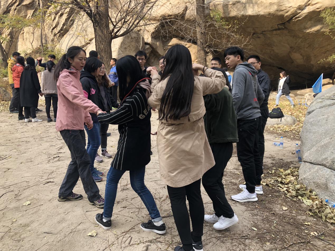 早饭过后,大家开始了上午的素质拓展项目——徒步行走。在进入神堂峪景区前,同学们通过进行踢毽子、“买菜游戏”等活动进行了充分的热身,也很好地带动了全员的兴致。