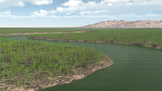 图2泥盆纪早期的河流与洪泛平原植被景观复原(徐家冲组;邓珍珍绘制)