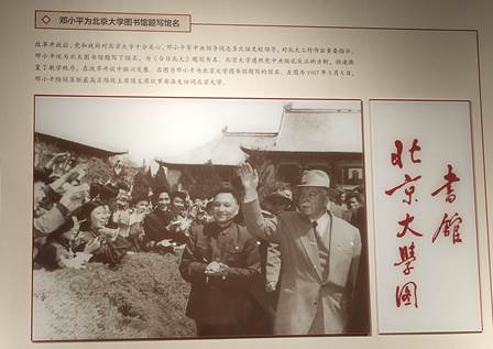 改革开放后,北京大学坚持党的领导,进入快速发展建设时期。邓小平同志一直非常关心北大发展,并为北大图书馆题写馆名。这一时期,北大学生在中国女排夺冠后发出“团结起来,振兴中华”的时代强音,打出“小平您好”的横幅表达人民拥护改革开放的心声;这一时期,北京大学提出创建世界一流大学目标,“当代毕昇”王选院士发明的汉字激光照排系统、徐关宪院士创建的稀土串级萃取理论、厉以宁教授提出的股份制改革理论相继涌现。2008年的北京奥运会中,北京大学承办了乒乓球赛事,北大奥运志愿者向世界人民展现了热情、敬业的精神风貌。