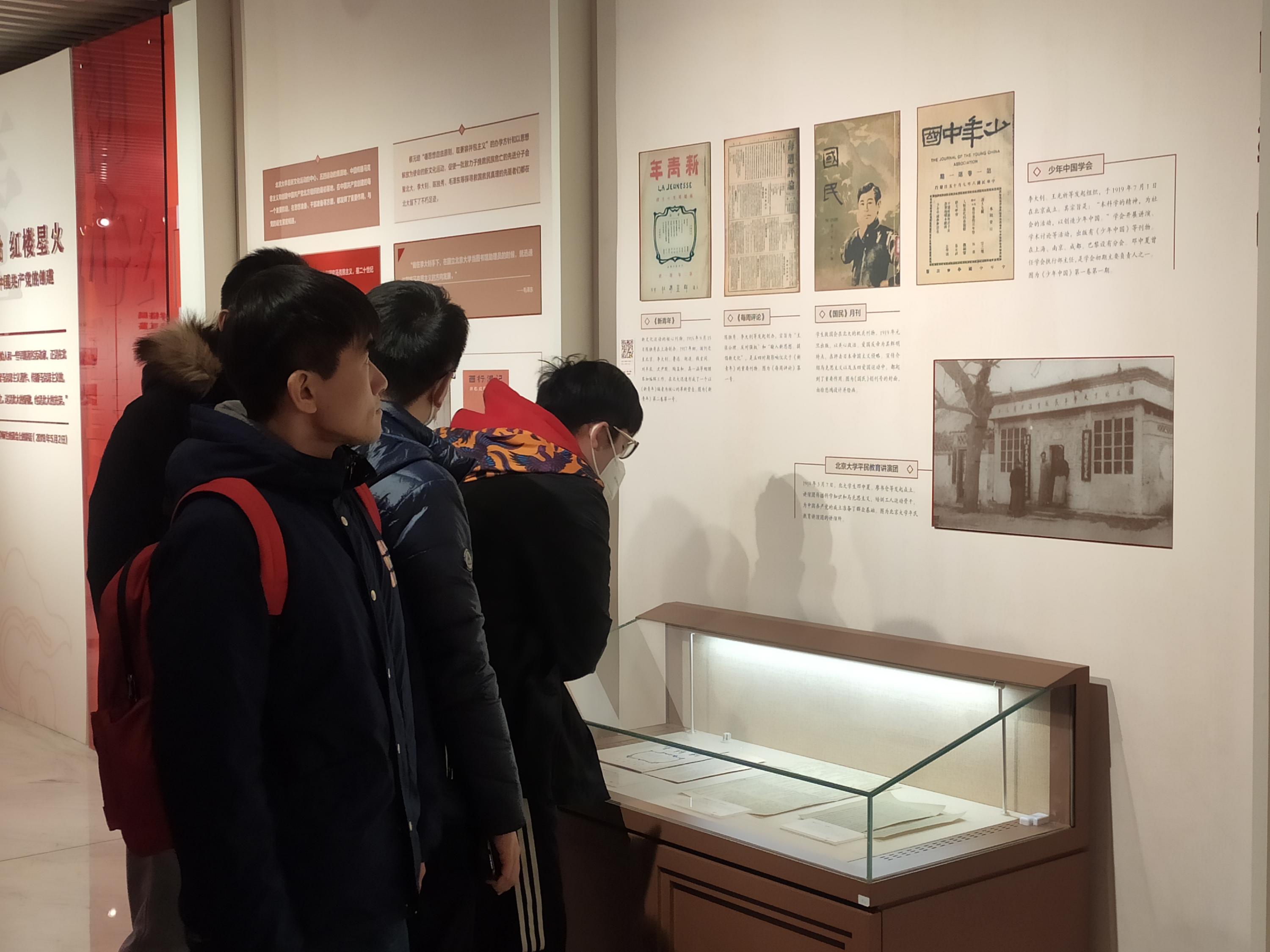 “在中国共产党的创立和发展过程中,有三名来自北大的共产党员至关重要,他们就是李大钊、陈独秀和毛泽东”,在展览馆兼职志愿解说员的党支部纪律委员刘学向大家介绍道。李大钊是在中国第一个传播马克思主义的思想家,也是北京共产党小组的创建者、北京大学的第一个支部书记,“是二十世纪初中国的播火者”。陈独秀创办了具有重大影响力的革命杂志《新青年》,拉开了新文化运动的大幕,在五四运动中扮演了重要角色。来到北京大学的青年毛泽东在这两位导师指导下,很快成长为了坚定的马克思主义者,并在将来的艰苦奋斗中带领党和人民取得了新民主主义革命的伟大胜利。