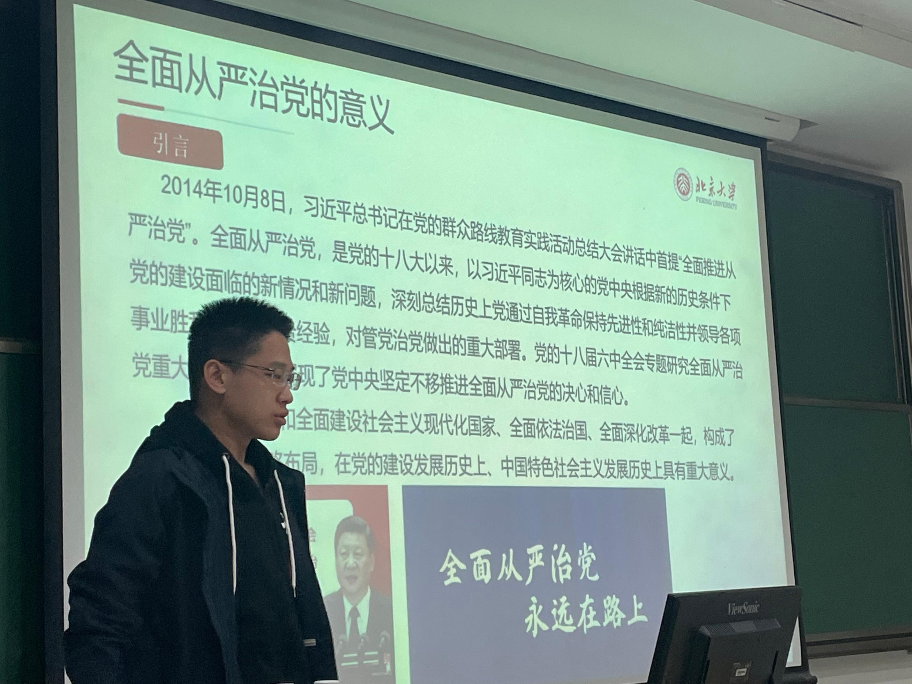 第五组同学分享题为“全面从严治党是党永葆生机活力、走好新的赶考之路的必由之路”,小组成员从全面从严治党的意义、举措、科学内涵及实际案例四个方面展开分享,从理论到北京师范大学党委原书记刘川生、四川省委原副书记李春城的实际案例,培训班成员对全面从严治党有了较为系统、全面的了解。