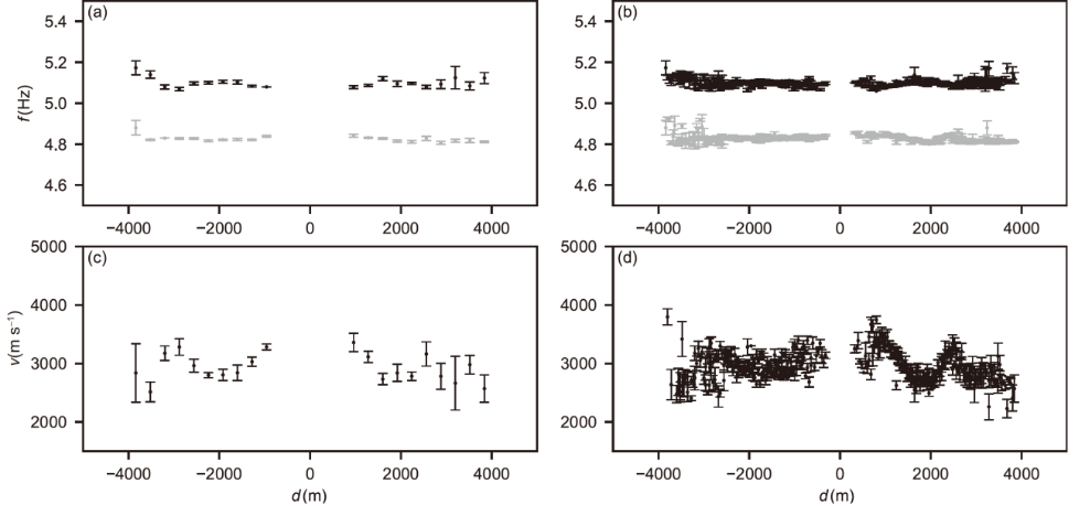 文章进一步提出了基于多普勒效应的介质波速测量方法。利用高铁的重复性进行多车次叠加后,可以有效提高测量精度(图3)。论文通过不同观测点的测量结果显示,该方法具有很好的一致性和稳定性,可用于监测高铁沿线地基的波速变化。