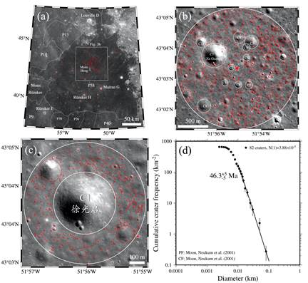 图2 (a) P58单元内主要源撞击坑(红点)分布;(b) 1 km范围内撞击坑分布;(c)徐光启撞击坑光学影像;(d)徐光启撞击坑统计定年结果