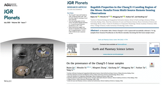 Bojun Jia, Wenzhe Fa, Minggang Xie, Yushan Tai, & Xiaofeng Liu. (2021). Regolith properties in the Chang’E-5 landing region of the Moon: Results from multi-source remote sensing observations.Journal of Geophysical Research: Planets,126(7), e2021JE006934, doi: 10.1029/2021JE006934.