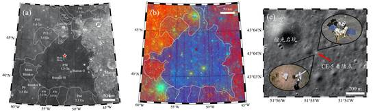 图1着陆区地质背景:(a)着陆区地质单元(P58)光学影像;(b)多波段伪彩色合成影像,红色表示钛含量低或玻璃含量高,绿色表示铁含量高,蓝色表示钛含量高;(c)着陆点局部光学影像。