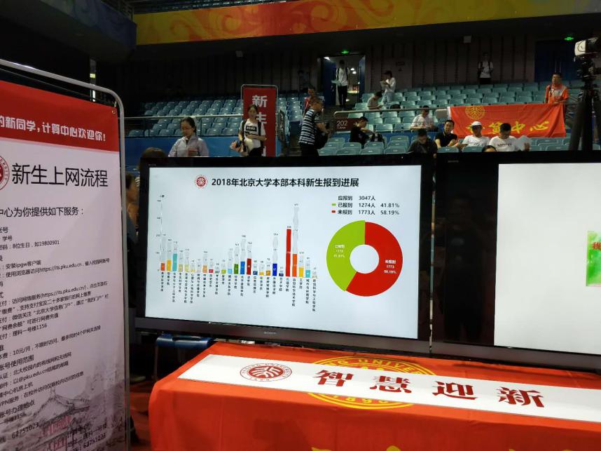 今年迎新首次采取数字迎新、智慧迎新的高技术手段,将新生报到情况实时录入量身定制的新生报到系统,不仅方便了对新生报到信息的查询与管理,而且在多处屏幕上显示有当前本科新生报到进展,柱形图与扇形图结合的形式使报到情况一目了然。