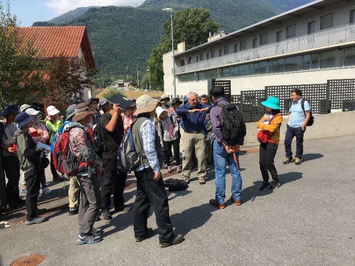 参观结束后,Peter Heitzmann与实习考察团一同前往Gotthard隧道北部出口附近,观察南阿尔卑斯区域的片麻岩露头。Peter Heitzmann对该区域的构造历史进行了讲解,并指出该地区近直立岩层的形成与阿尔卑斯造山带的两期俯冲有关。韩宝福教授、Andrea教授、江大勇教授以及吴朝东教授进行了补充说明和延伸拓展。同学们积极提问,Peter Heitzmann及各位教授一一进行了解答。之后双方共进午餐。随后道别。