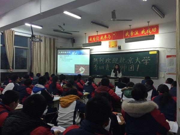 之后,讲师团成员分别在高三、高二年级的理科、文科不同班级同时进行宣讲。2014级矿物学、岩石学和矿床学专业硕士生郑萌萌通过分享自己在北大本科和研究生阶段的学习经历为在场同学展现了丰富多彩的北大校园生活;2012级地质学专业本科生刘雨薇从地质学的基本定义和研究对象切入,讲述了自身学习研究地质学的心得体会,鼓励同学们“选我所爱,爱我所选”。在场师生边听边记,不时积极提问,表示收获颇多。