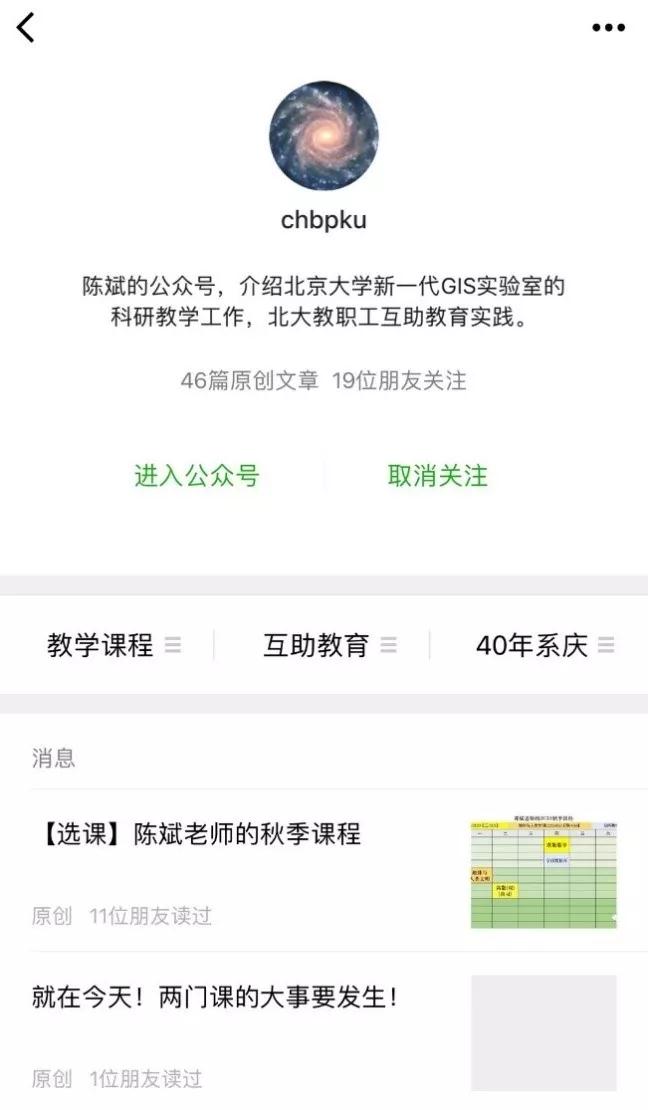 在忙碌的教学与科研工作之余,陈斌老师还运营更新着自己的公众号,介绍北京大学新一代GIS实验室的科研教学工作与北大教职工互助教育实践。