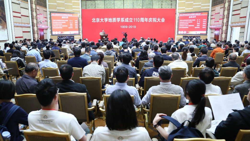 5月3日,北京大学地质学系110周年系庆大会在英杰交流中心隆重举行,图为大会现场。