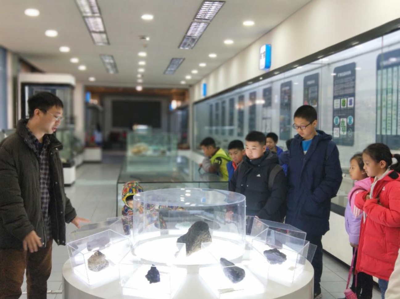 科普课程结束后,周敏老师带着孩子们开始了一场“博物馆奇妙之旅”。北京大学地质博物馆内陈列展出了矿物、岩石、矿床、构造地质和古生物等近千件各类典型地学标本。从洪荒世界见证生命的化石,到作为地球细胞的矿物与岩石,丰富多彩的地质学世界、栩栩如生的讲解让孩子们领略到了地球演化的神奇和大自然的鬼斧神工。