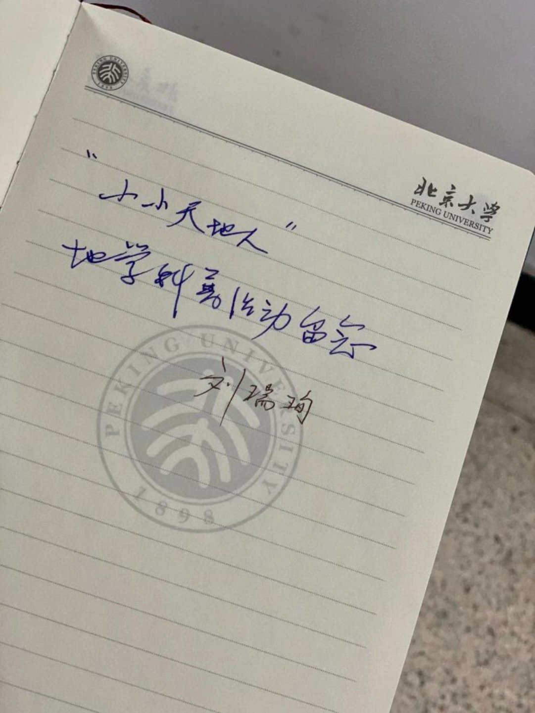历时一天的地学科普活动结束了,最后,孩子们收到了一份特殊的礼物——由北京大学地质学系前系主任刘瑞珣教授题字的北京大学纪念笔记本。刘瑞珣教授曾为地空学院院友通讯“天地人”期刊题字,此次他再提笔,将老一辈地学者的殷殷期望寄予“小小天地人”们。