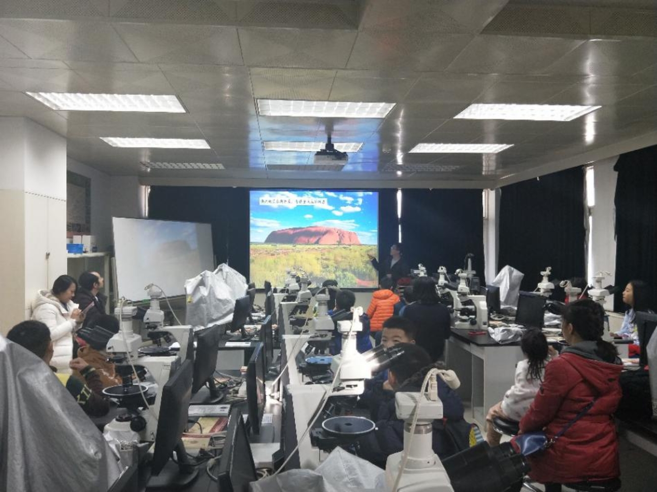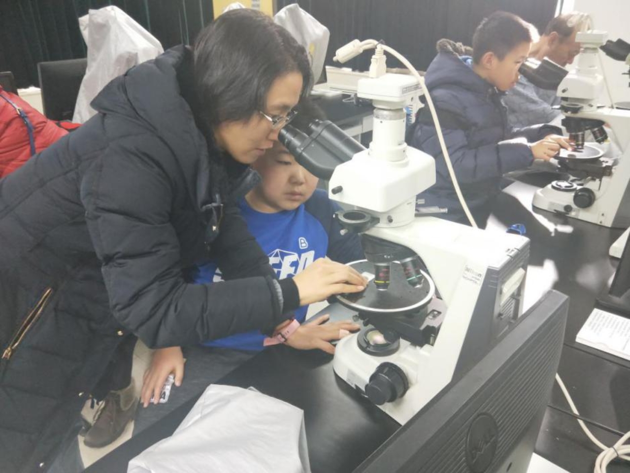 从地质博物馆出来,孩子们又进入到了显微镜下的微观世界,崔莹老师带领孩子们体验了显微镜的使用。