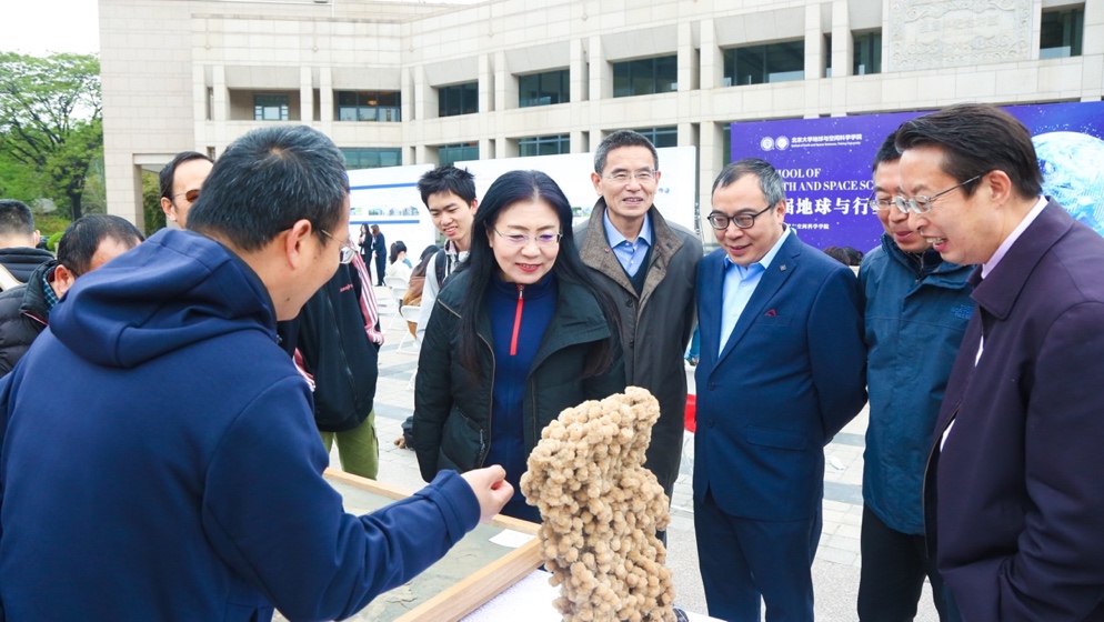 北京大学首届地球与行星科学文化周开幕式现场布设地空学院成果展、化石矿石展、天地人文化节等现场活动。江大勇带领与会嘉宾参观展览。