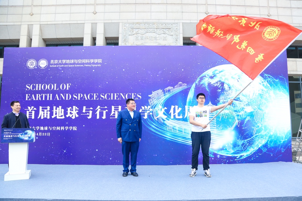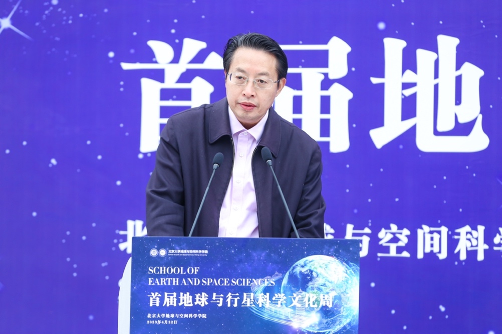 4月22日上午10时,北京大学首届地球与行星科学文化周开幕式在百周年纪念讲堂广场开启。自然资源部宣传教育中心纪委书记张拯,北京大学党委副书记、副校长宁琦,北京大学学生工作部部长、团委书记户国栋,易智瑞信息技术有限公司高级副总裁、研究院院长沙志友,北京市规划和自然资源委员会勘察设计管理处副处长陈广峰,北京大学地球与空间科学学院院长张立飞,党委书记李培军,副院长沈冰,党委副书记江大勇、陈云超等出席开幕式。北京大学师生代表参加开幕式。开幕式由陈云超主持。