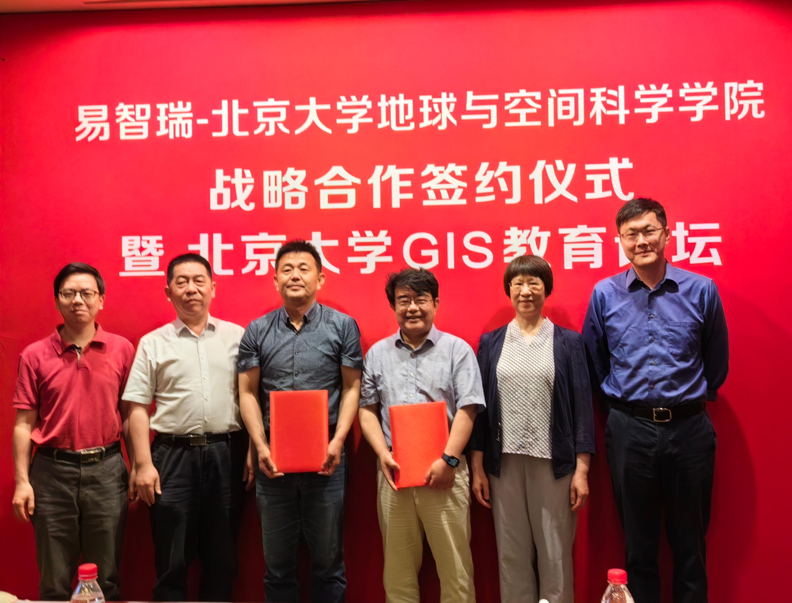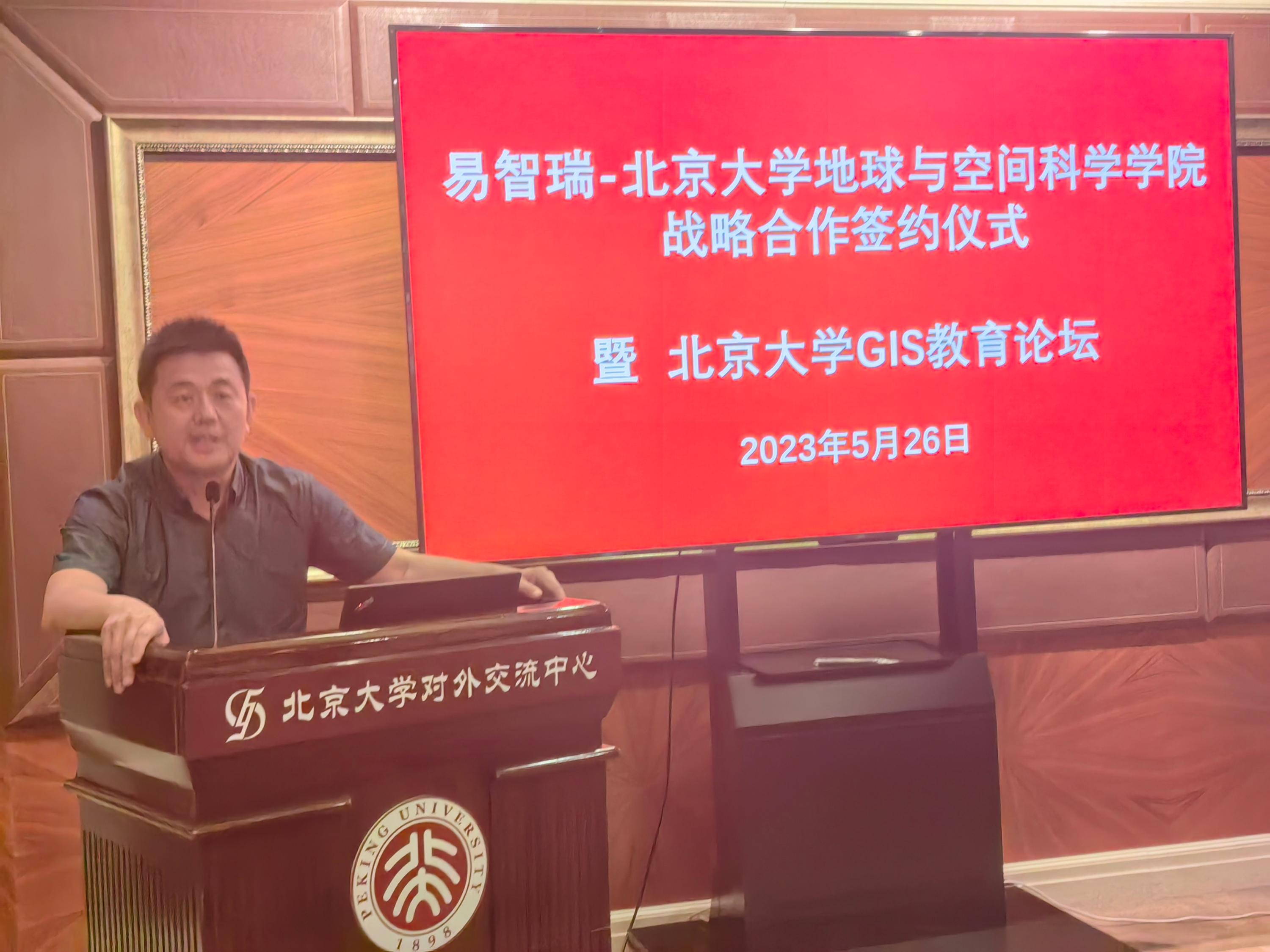 会议首先进行了易智瑞-北京大学地球与空间科学学院战略合作签约仪式。北京大学遥感所李梅副教授主持活动。地空学院副院长刘瑜教授致欢迎词,并代表学院签署了战略合作协议,此次合作易智瑞软件面向全校师生赠送国产地理信息系统平台最新版本GeoScenePro软件包不少于3年的使用权,用于学校开展本科、研究生实验教学和教师科学研究,同时双方将在时空大数据分析、新媒体地图以及地理信息应用领域加强合作,实现优势互补,利用全球最新技术、最新思路、最新理念,引领GIS教育创新。北京大学教务部刘建波副部长、设备部周勇义副部长、计算中心李庭晏副主任、网信办陈晨副主任、标识办王心阳等相关职能部门领导、以及院系领导共同见证了捐赠仪式。随后,易智瑞信息技术有限公司蔡晓兵高级副总裁开展了“教育为本,智赢未来”的主题报告。