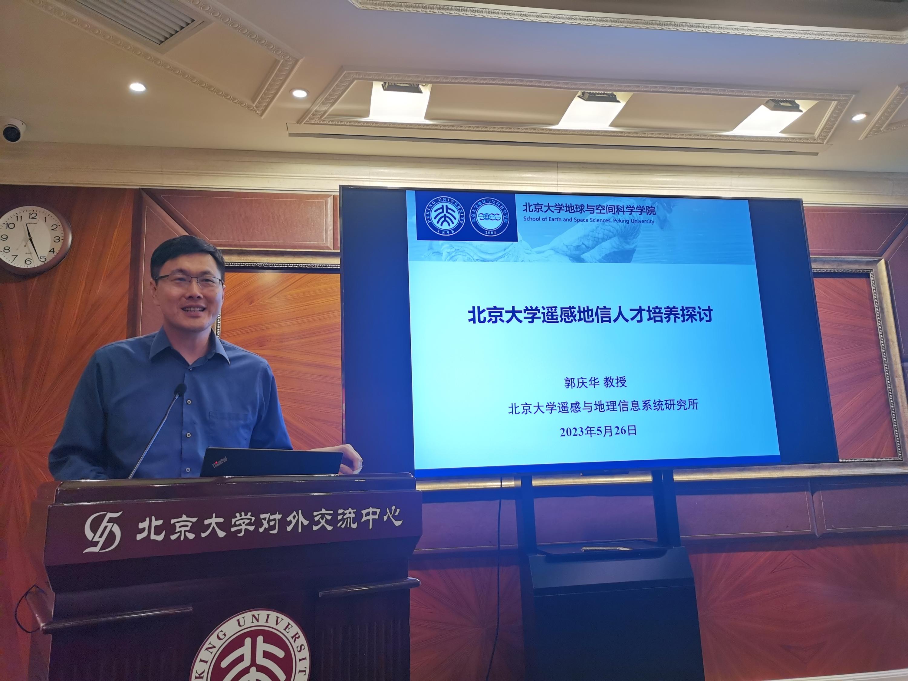 北京大学遥感与地理信息系统研究所所长郭庆华教授介绍了“北京大学遥感地信人才培养”的情况,提出拓展国际视野和加强与产业界联系,以及培养创新性人才的重要性。