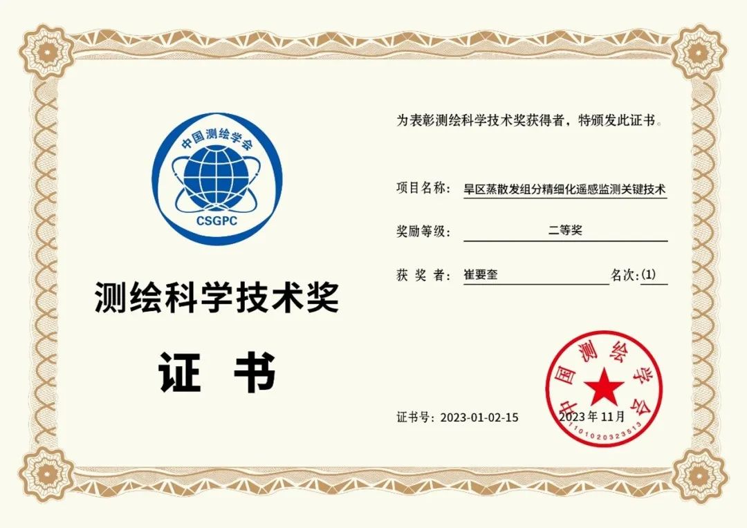 近日,中国测绘学会公布了2023年测绘科学技术奖获奖名单。由北京大学地空学院遥感与地理信息系统研究所崔要奎老师主持,北京大学、中国农业科学院农业资源与农业区划研究所、中国科学院空天信息创新研究院、中国科学院地理科学与资源研究所、南昌工程学院等单位联合申报的《旱区蒸散发组分精细化遥感监测关键技术》项目荣获测绘科学技术奖二等奖!