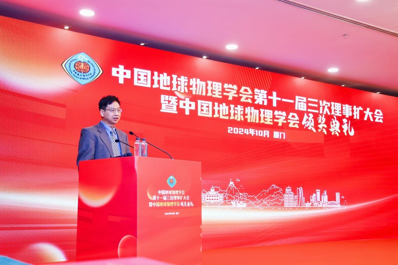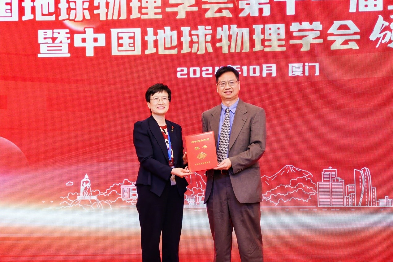 2024年10月21日,中国地球物理学会第十一届三次理事扩大会暨颁奖典礼在厦门国际会展中心隆重举行。颁奖典礼上,理事长底青云院士宣读了中国地球物理学会科学技术奖获奖项目及获奖人名单。北京大学地球与空间科学学院讲席教授宋晓东荣获2024年中国地球物理学会科学技术创新奖一等奖。底青云院士为获奖人宋晓东教授颁发了荣誉证书。