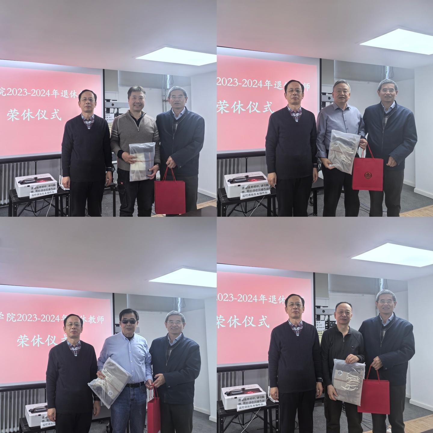 最后,张立飞和李培军为荣休教师颁发学院精心准备的纪念品,与会领导与荣休教师合影留念。