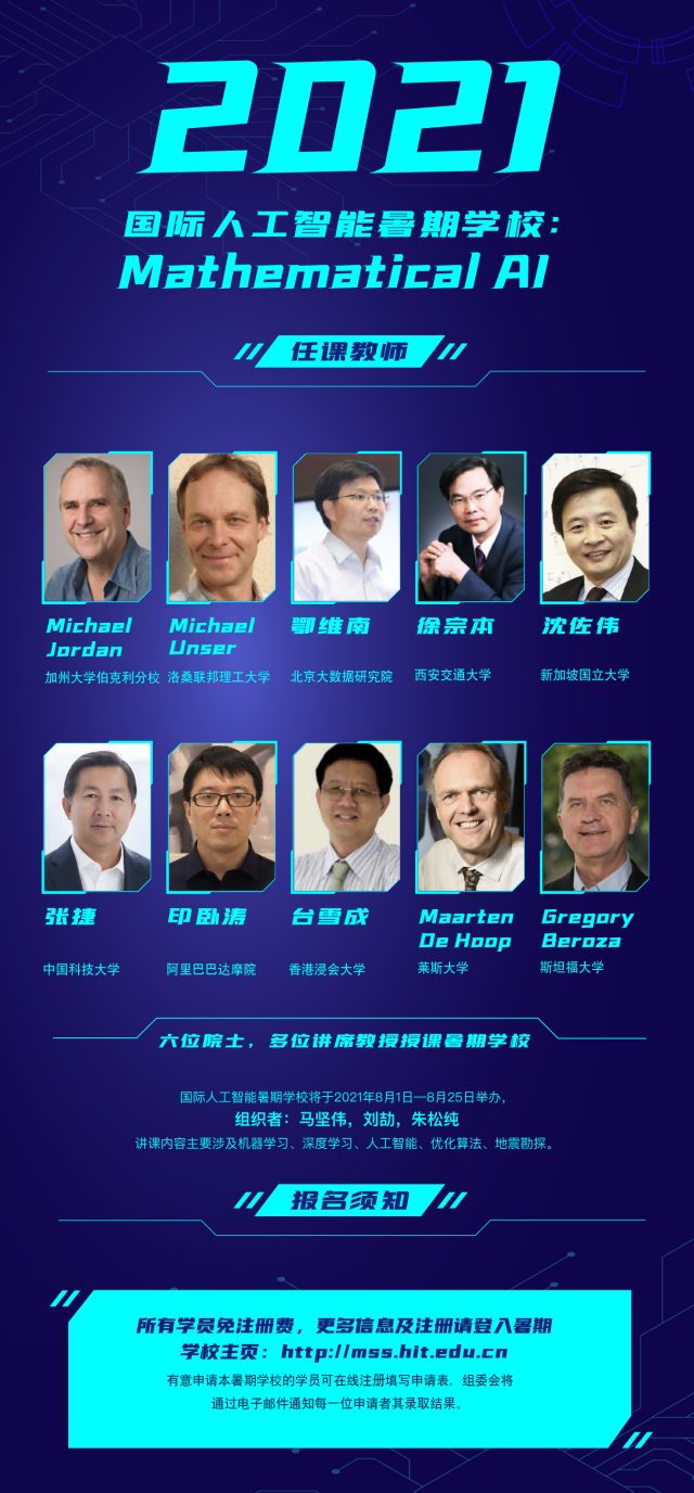 2021国际人工智能暑期学校于2021年8月1日—8月25日举办。根据防疫要求,本次暑期学校线上进行。邀请全球顶尖专家授课,包括:Michael Jordan (加州大学伯克利分校,美国三院院士,英国皇家学会院士, IJCAI终身成就奖获得者); Michael Unser(洛桑联邦理工大学,瑞士工程院院士);鄂维南(普林斯顿大学、北京大数据研究院,中国科学院院士);徐宗本(西安交通大学,中国科学院院士);沈佐伟(新加坡国立大学,新加坡科学院院士);张捷(中国科技大学,美国国家工程院院士);印卧涛(阿里巴巴达摩院决策智能实验室负责人,原加州大学洛杉矶分校教授);台雪成(香港浸会大学,讲席教授);Maarten De Hoop (莱斯大学,讲席教授);Gregory Beroza (斯坦福大学,讲席教授)。讲课内容主要涉及人工智能、优化算法、图像处理、地球物理学应用的交叉学科。