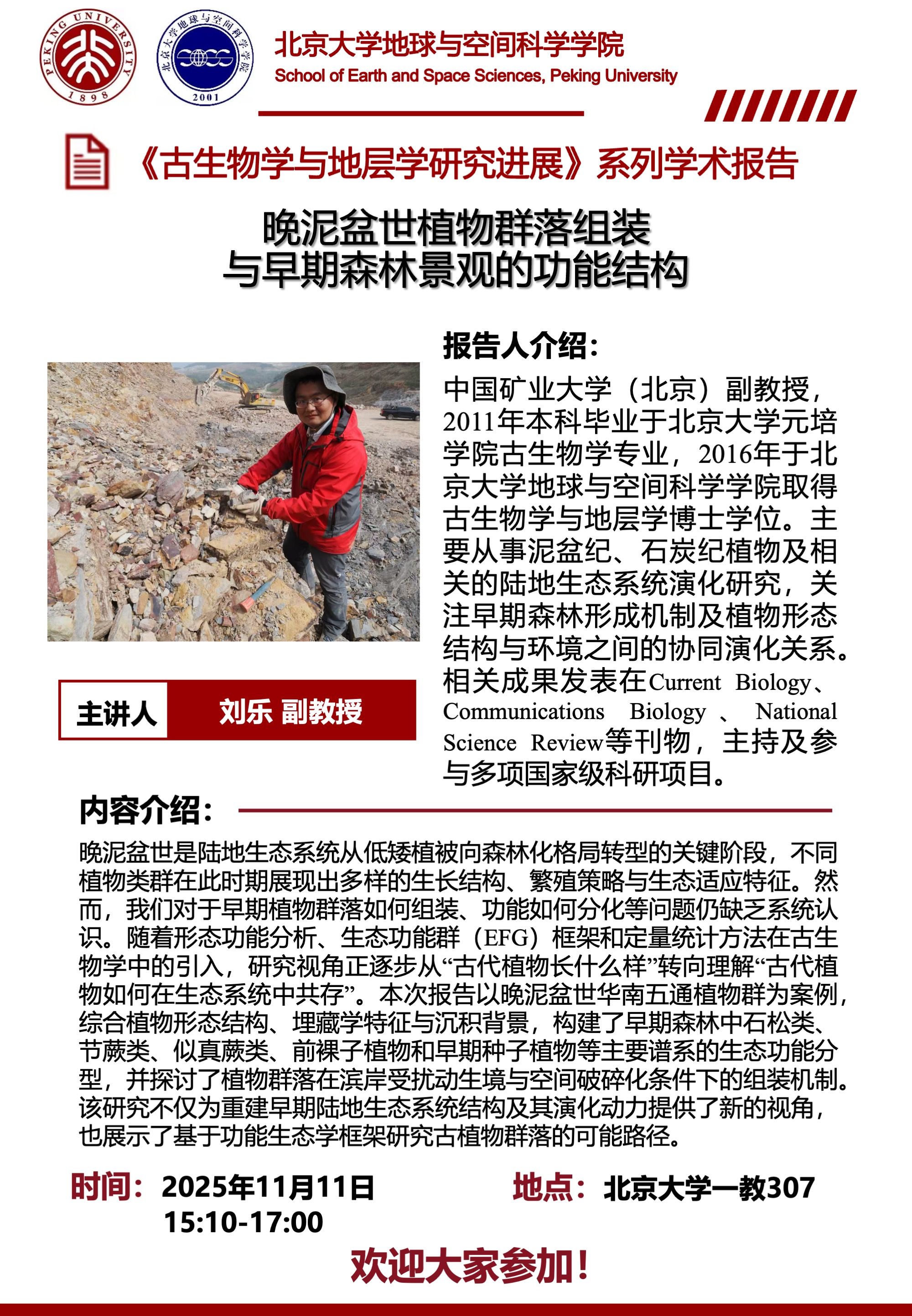 晚泥盆世是陆地生态系统从低矮植被向森林化格局转型的关键阶段,不同植物类群在此时期展现出多样的生长结构、繁殖策略与生态适应特征。然而,我们对于早期植物群落如何组装、功能如何分化等问题仍缺乏系统认识。随着形态功能分析、生态功能群(EFG)框架和定量统计方法在古生物学中的引入,研究视角正逐步从“古代植物长什么样”转向理解“古代植物如何在生态系统中共存”。本次报告以晚泥盆世华南五通植物群为案例,综合植物形态结构、埋藏学特征与沉积背景,构建了早期森林中石松类、节蕨类、似真蕨类、前裸子植物和早期种子植物等主要谱系的生态功能分型,并探讨了植物群落在滨岸受扰动生境与空间破碎化条件下的组装机制。该研究不仅为重建早期陆地生态系统结构及其演化动力提供了新的视角,也展示了基于功能生态学框架研究古植物群落的可能路径。