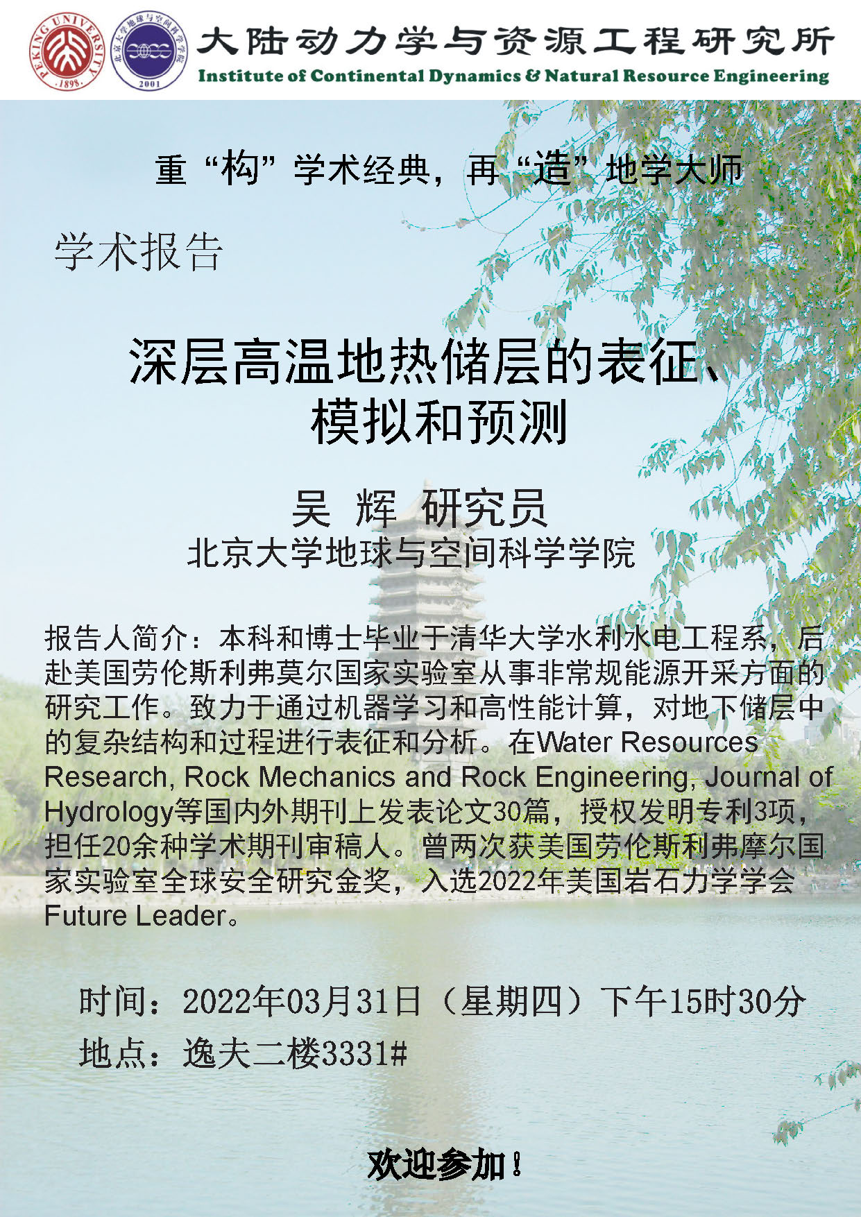 个人简介:吴辉,地球与空间科学学院研究员、助理教授。本科和博士毕业于清华大学水利水电工程系,后赴美国劳伦斯利弗莫尔国家实验室从事非常规能源开采方面的研究工作。致力于通过机器学习和高性能计算,对地下储层中的复杂结构和过程进行表征和分析。在Water Resources Research, RockMechanics and Rock Engineering, Journal of Hydrology等国内外期刊上发表论文30篇,授权发明专利3项,担任20余种学术期刊审稿人。曾两次获美国劳伦斯利弗摩尔国家实验室全球安全研究金奖,入选2022年美国岩石力学学会Future Leader。