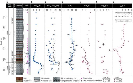 针对该时期的气候变化,沈佳恒研究员利用远古叶绿素的生物标志化合物单体碳同位素定量重建了该时期的大气二氧化碳浓度(图1和2)。重建结果显示第一幕灭绝,pCO2最低;随后pCO2快速上升,步入缓慢上升期,此高pCO2一直持续至早三叠世的第二幕灭绝,并达到最高值;之后pCO2开始缓慢下降。此重建结果详细刻画出了两幕灭绝时不同的pCO2特征。生物标志化合物单体氮同位素被用于定量重建该时期海洋初级生产力群落结构(细菌及真核生物)的演化(图1和2)。重建结果显示第一幕灭绝时,海洋初级生产群落以真核藻类(eukaryotes)为主;而第二幕灭绝时,蓝细菌(cyanobacteria)则以绝对优势~100%全面占据海洋初级生产群落。