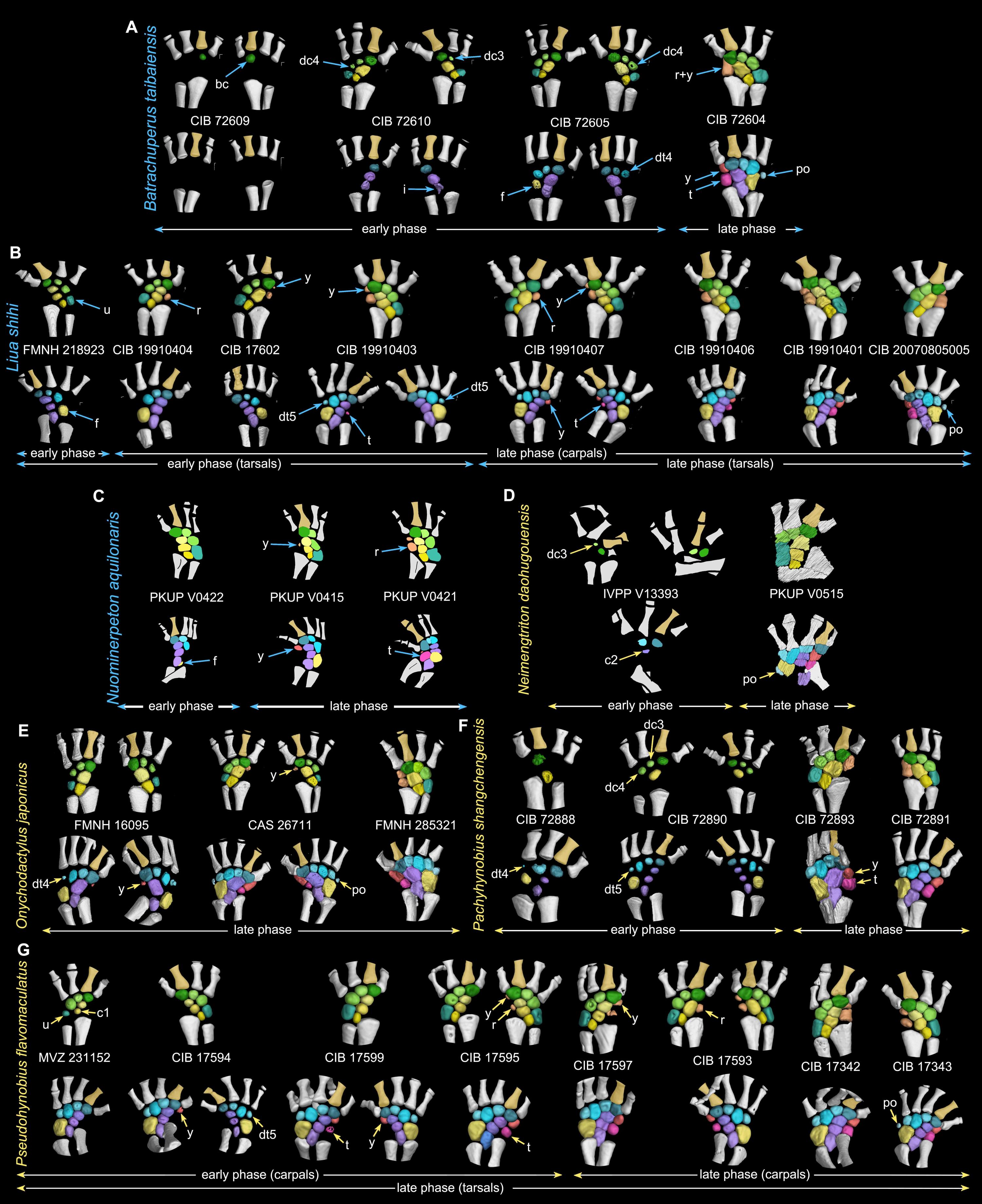 图2 蝾螈类原始支系泛小鲵类(Panhynobia)的腕骨与跗骨骨化模式。其中远端腕/跗骨展现出轴前优先性,近端腕/跗骨展现出轴后优先性。