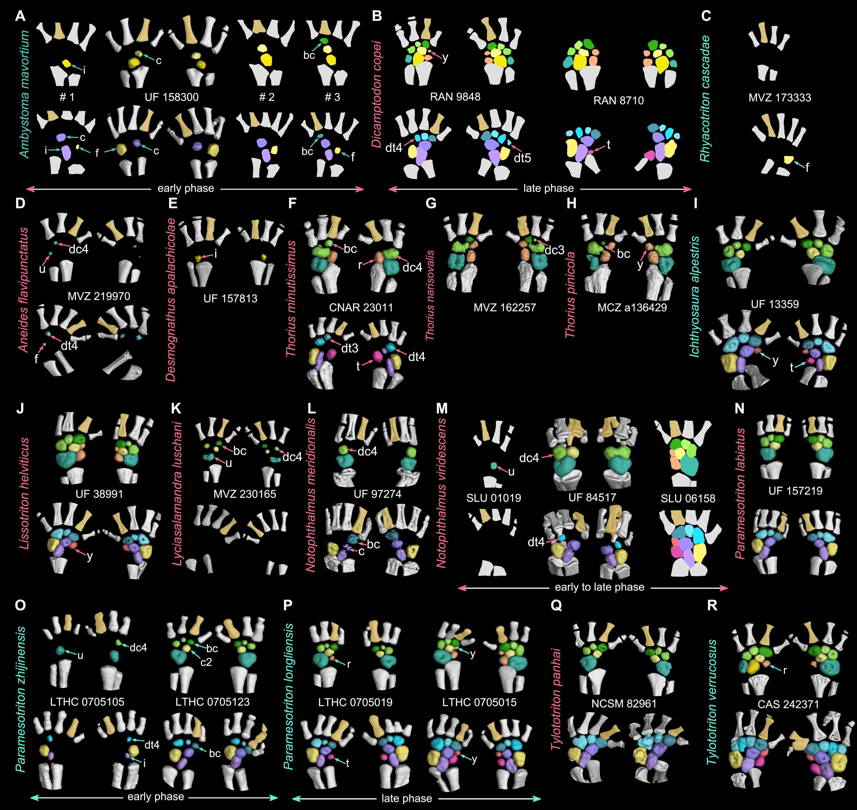 图3 蝾螈类进步支系蝾螈亚目(Salamandroidea)的腕骨与跗骨骨化模式。其中所有属种的近端腕/跗骨以及部分无肺螈科(D, Aneides; F-H, Thorius)和蝾螈科(K, Lyciasalamandra; L,M, Notophthalmus; O, Paramesotriton)的属种的远端腕骨展现出轴后优先性,其余属种的远端腕/跗骨展现出轴前优先性。
