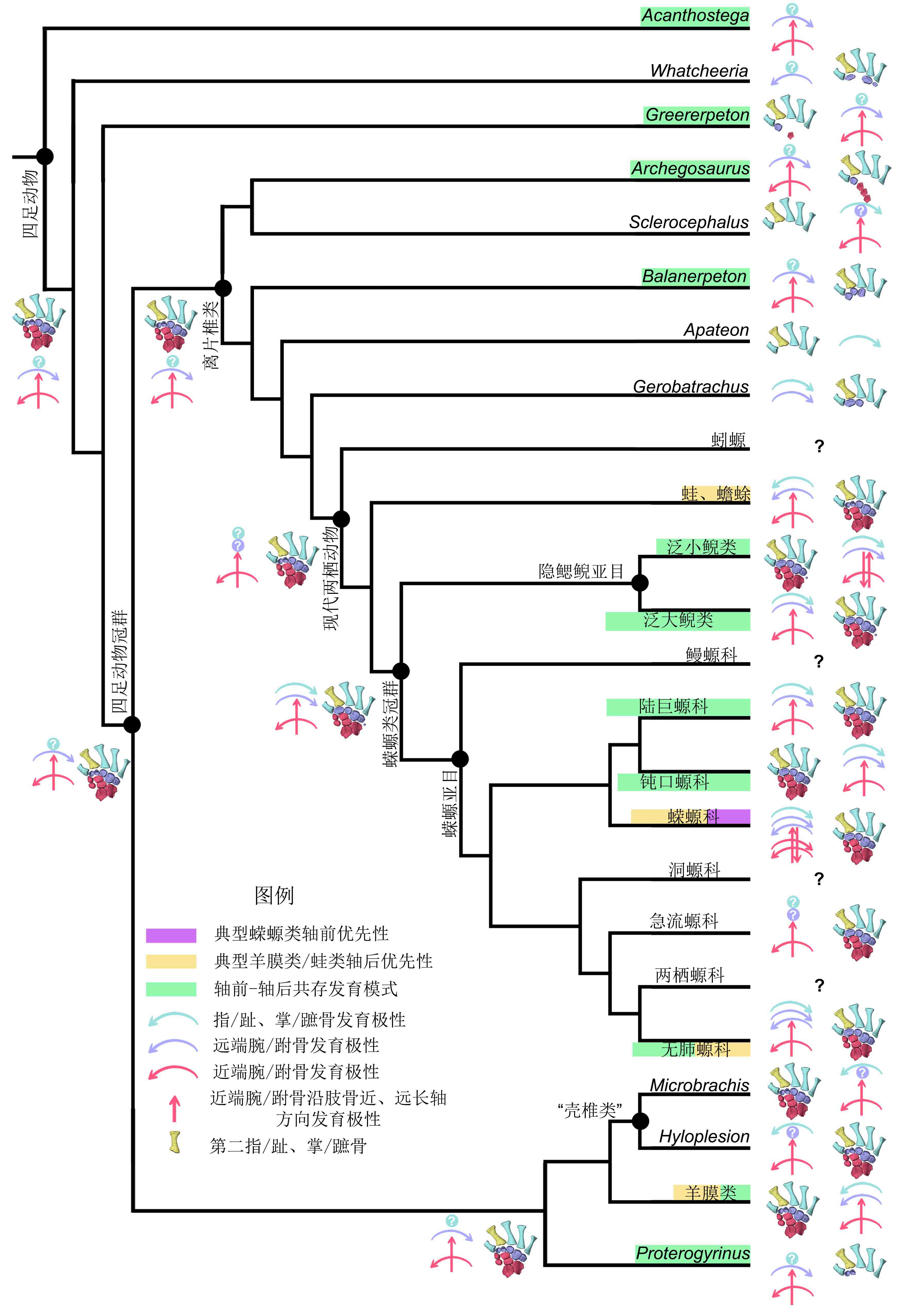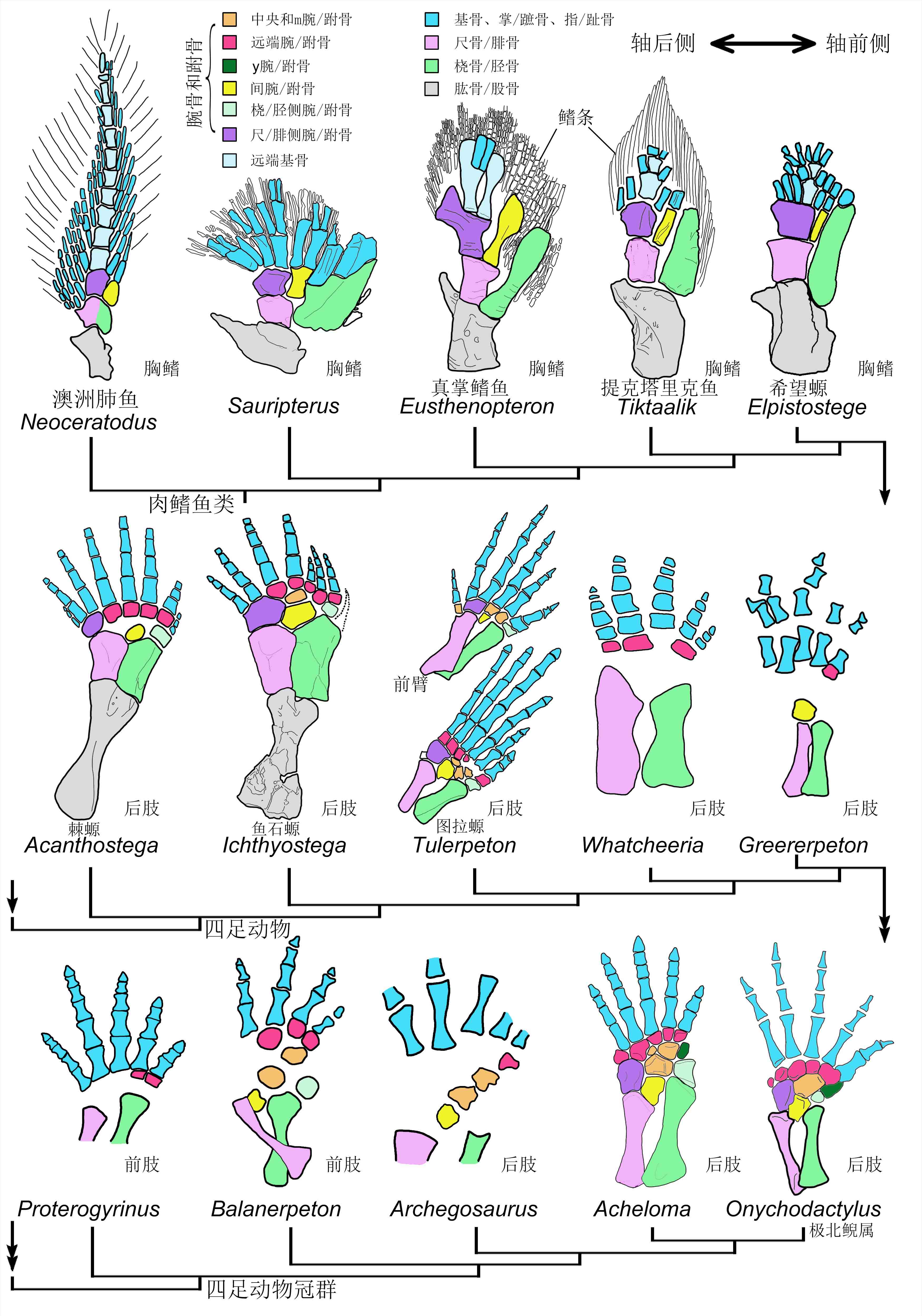 此外,胚胎发育研究为了解从鱼鳍到四肢的演化开启了新的篇章。前人研究发现现代四足动物的最原始类群——蝾螈类(一类现代两栖动物,代表物种为中国大鲵,俗称娃娃鱼)肢骨的早期发育过程(间充质细胞聚合[mesenchymal condensation]和软骨成骨[chondrification])存在轴前优先性(preaxial dominance),即长轴前侧(靠近大拇指的一侧)的骨骼先于后侧的骨骼出现。例如,墨西哥钝口螈的脚趾形成顺序为II-I-III-IV-V,胫骨先于腓骨形成。这一发育模式与蛙类和羊膜动物肢骨早期发育过程中所展现的轴后优先性(postaxial dominance)恰好相反,如蛙类或乌龟的脚趾形成顺序为IV-V-III-II-I,胫骨也晚于腓骨形成。四足动物,特别是非羊膜动物在四肢早期发育过程中的模式差异被普遍认为也存在于之后的骨化过程(ossification)中。