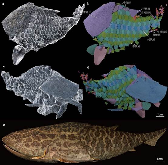 本研究报道了一件精美而难得的初始全颌鱼新化石,关联保存了近乎完整的鳞片覆盖的后半部分身体和鳍棘。运用高精度断层扫描与三维重建技术,研究人员详细研究了该标本的鳞片形态学和组织学,以及整个鳞列分区情况,科学地复原了初始全颌鱼的完整面貌,探讨了有颌类鳞片与鳍棘的演化,为研究有颌类冠群起源及硬骨鱼类和软骨鱼类重要特征的起源提供了重要化石实证。