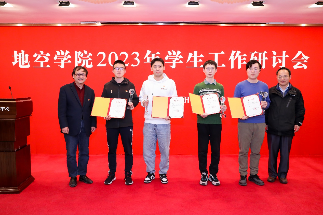 会议对荣获“地空学院2022年学生年度人物”的五位同学和一个集体进行表彰,宁杰远、江大勇对到场的获奖者进行颁奖。