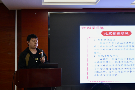 中国地震局地震预测研究所人力资源部党支部陈江河分享的主题是“科研巨匠,国之栋梁:李四光精神的传承与发扬”。作为新时代学生党员,同学们要坚定科技报国理想信念,将“李四光精神”转化为科研工作高质量发展的内在动力。