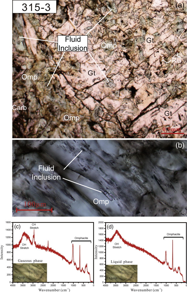 图2.西天山榴辉岩中的矿物组合以及绿辉石中的碳氢化合物包裹体