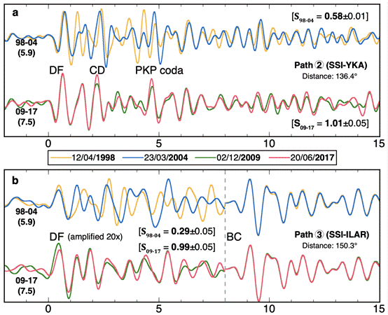图1. 重复地震的内核信号随时间变化示例图。在1998年到2004年间,地震波的波形存在明显的变化,而在2009到2017年间,并未观测到波形的变化。不经过内核的波形一直保持不变(图b中的BC震相)。