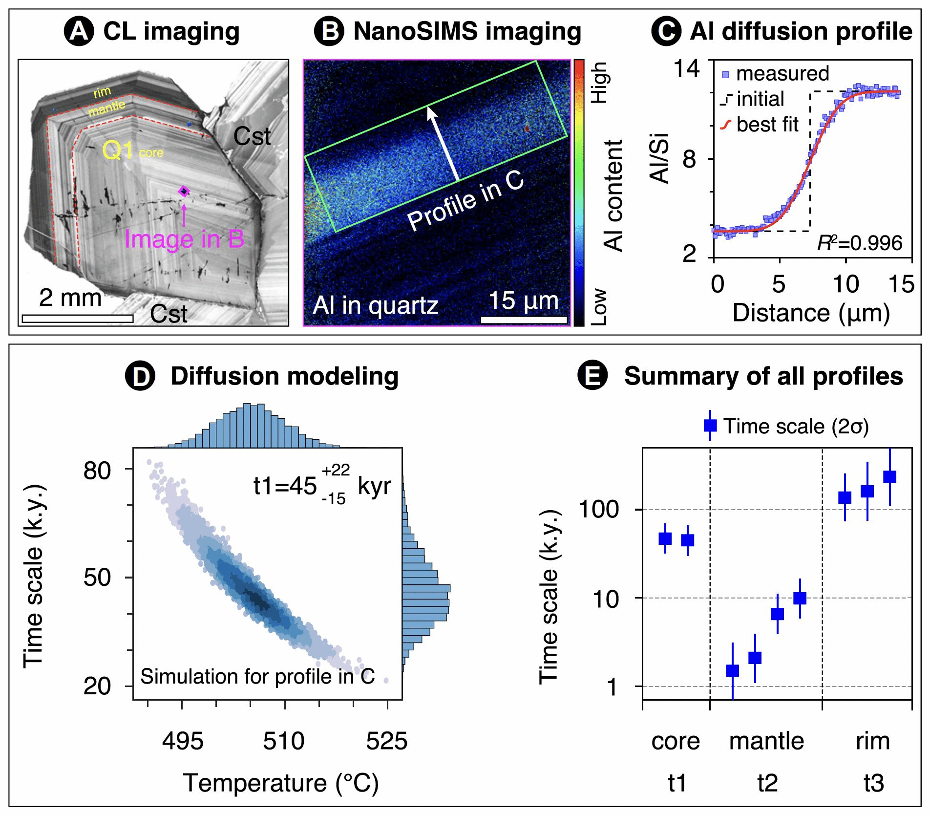 图2, 通过微区分析技术实现成矿过程的高时间分辨率解析。(A),石英和锡石的阴极发光图像约束矿物生长历史与共生关系;(B)纳米离子探针石英Al含量分布成像;(C)石英Al扩散曲线拟合;(D)石英Al扩散年代学模拟计算;(E)热液体系不同阶段的时间尺度。