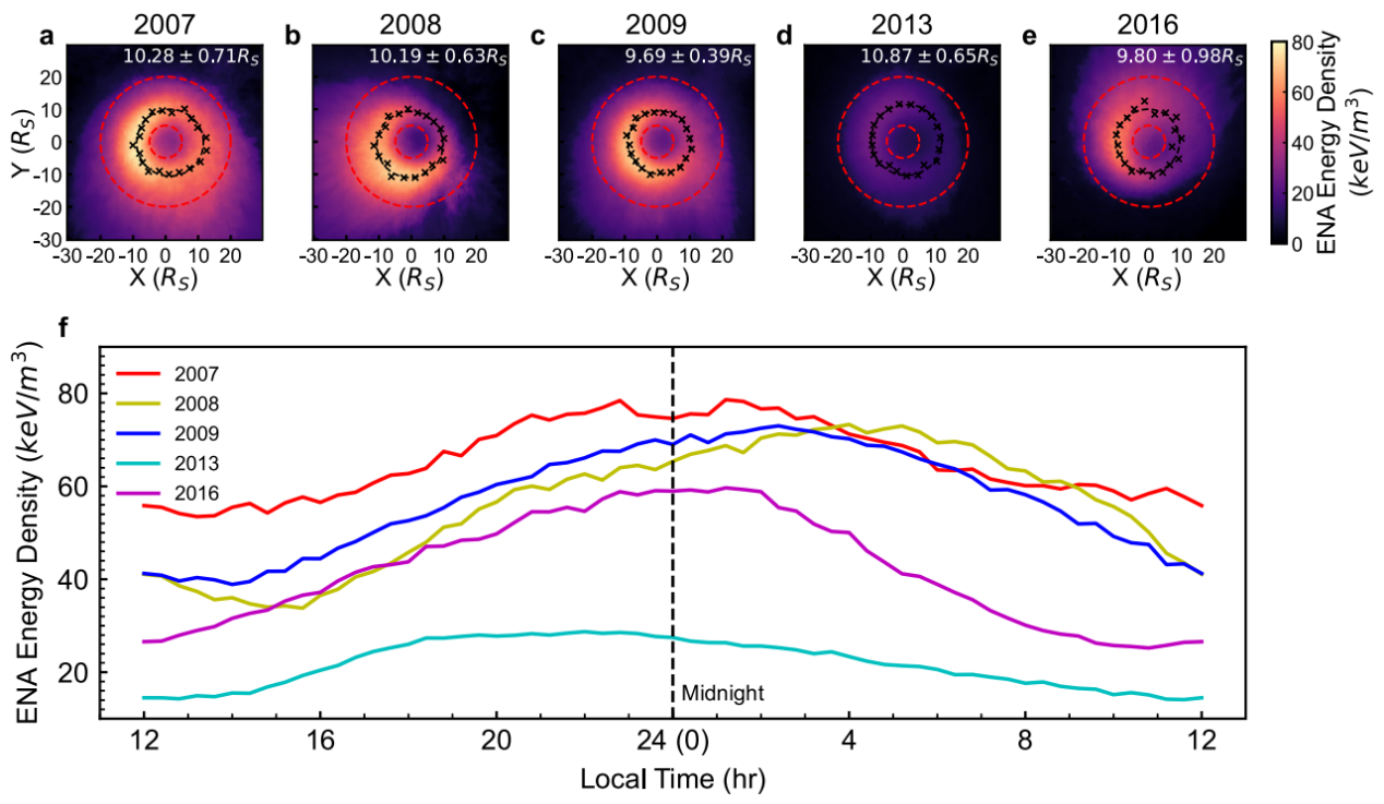 北京大学空间物理与应用技术研究所乐超研究员课题组利用土星探测卫星卡西尼号(Cassini)上搭载的能量中性原子成像仪研究了土星环电流的长期分布特征,发现由超热等离子体(~24-230 keV)贡献的环电流成分在空间分布和强度上存在近11年的长周期变化,并将这种变化与太阳活动周期相关联,提出太阳活动周期调制土星磁层中等离子体加速与输运过程的可能性。相关成果于近期发表于学术期刊《自然·通讯》(Nature Communications)。