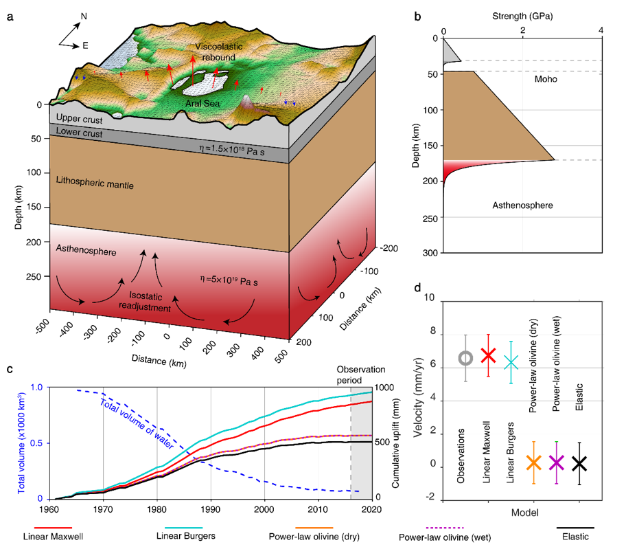 下地壳和上地幔的流变结构和黏滞系数决定了地幔对流和板块构造的模式。目前关于上地幔黏度的研究主要通过大地震震后变形或者冰川均衡调整推断得到,研究范围集中在板块边界和两极附近区域。学界在十年时间尺度上对板块内部软流圈黏度的认知几乎是空白。这是因为在没有地震的情况下,只有非常大的质量变化才能激发上地幔的流动,从而在地表产生可测量的形变。地空学院王腾助理教授与美国南加州大学和南方科技大学学者合作,通过合成孔径雷达干涉(InSAR)技术获取了因咸海水分流失造成的地表抬升速率场,并据此推断了欧亚大陆内部上地幔流变性质。研究成果以“咸海干涸揭示的欧亚内陆弱软流圈(Weak asthenosphere beneath the Eurasian interior inferred from Aral Sea desiccation)”为题,2025年4月7日以封面文章发表于《自然·地球科学(Nature Geoscience)》,并被选为“醒目(highlight)”论文。